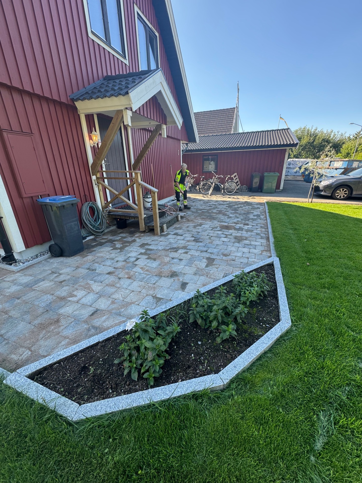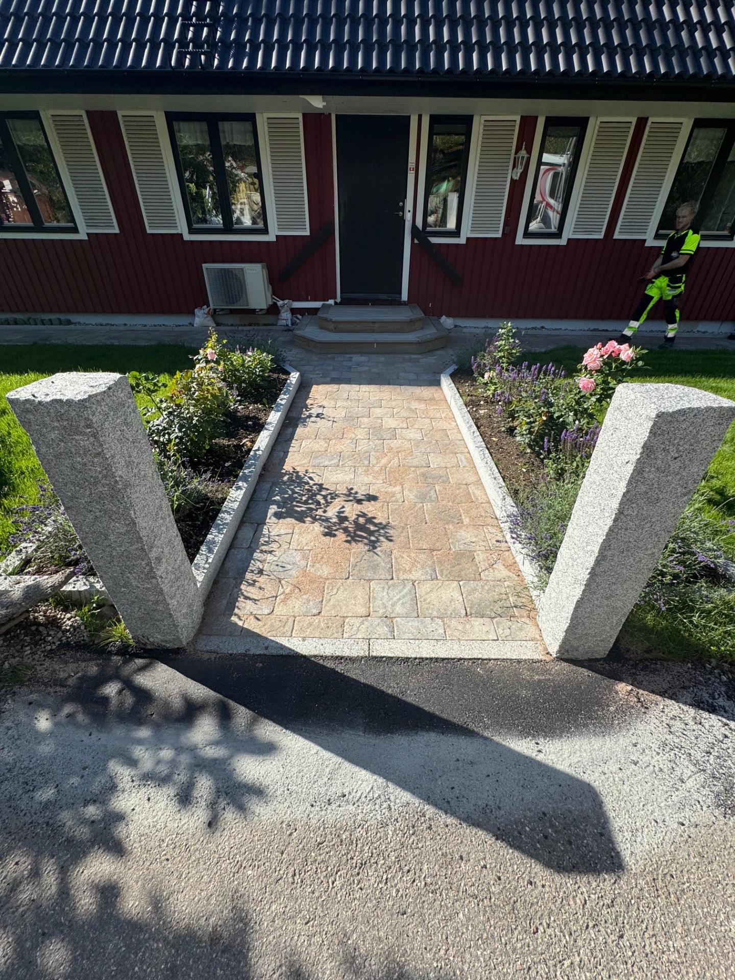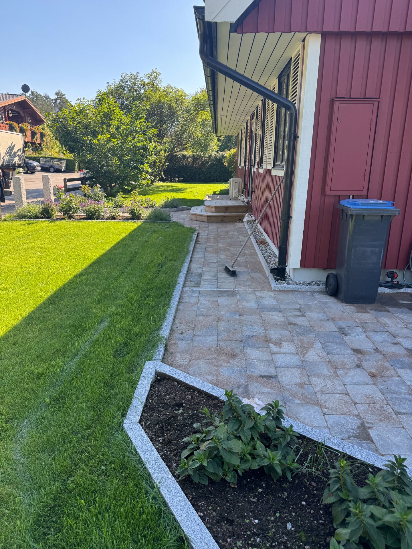 Hel utemiljö skapad åt en kund i Täby efter att vi dränerat om runt grunden och tilläggsisolerat samt värmt upp och fuktat av torpargrunden. Vi har satt kantsten, lagt plattor, byggt trappa och provisorisk trappa, monterat brunnsbetäckningar, asfalterat satt tunga stenstolpar med kran etc hela markytan utsidan förutom staketet.