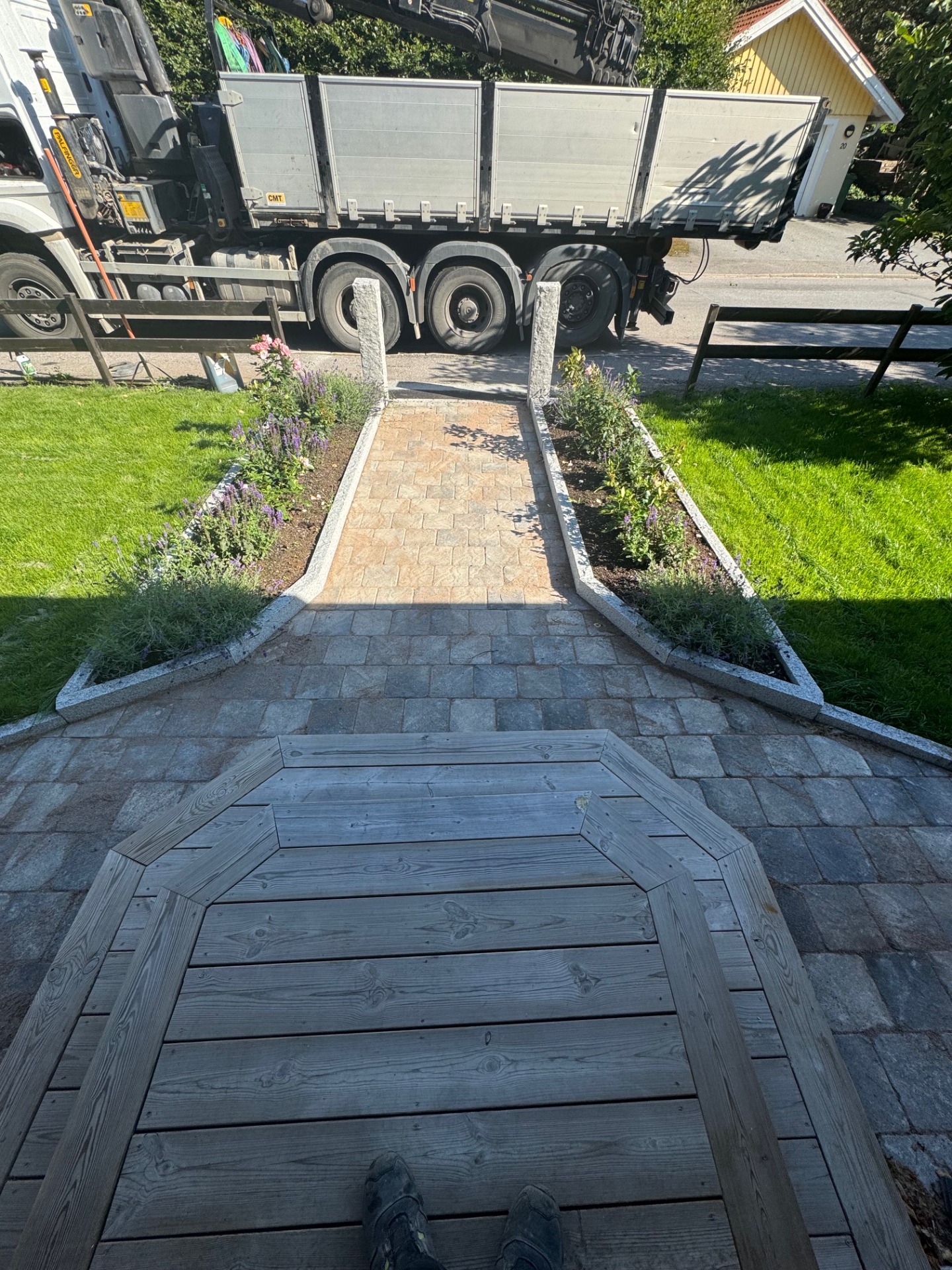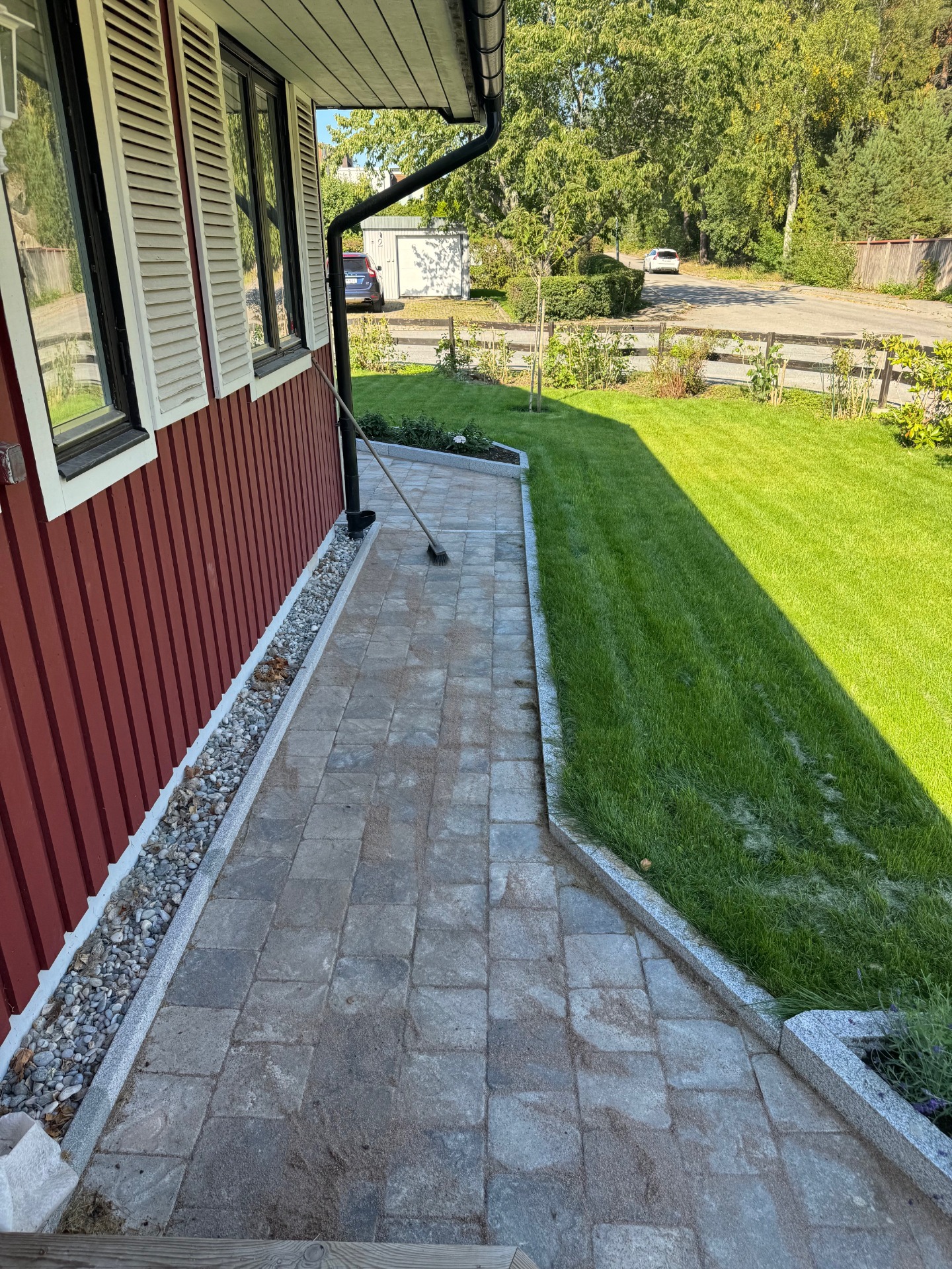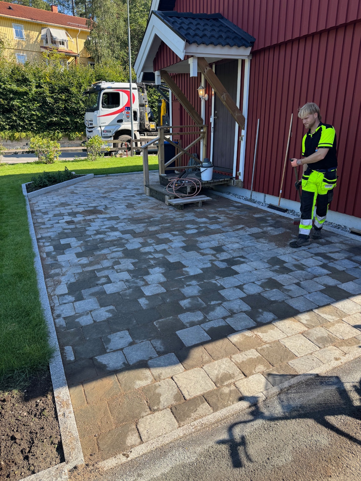 Hel utemiljö skapad åt en kund i Täby efter att vi dränerat om runt grunden och tilläggsisolerat samt värmt upp och fuktat av torpargrunden. Vi har satt kantsten, lagt plattor, byggt trappa och provisorisk trappa, monterat brunnsbetäckningar, asfalterat satt tunga stenstolpar med kran etc hela markytan utsidan förutom staketet.