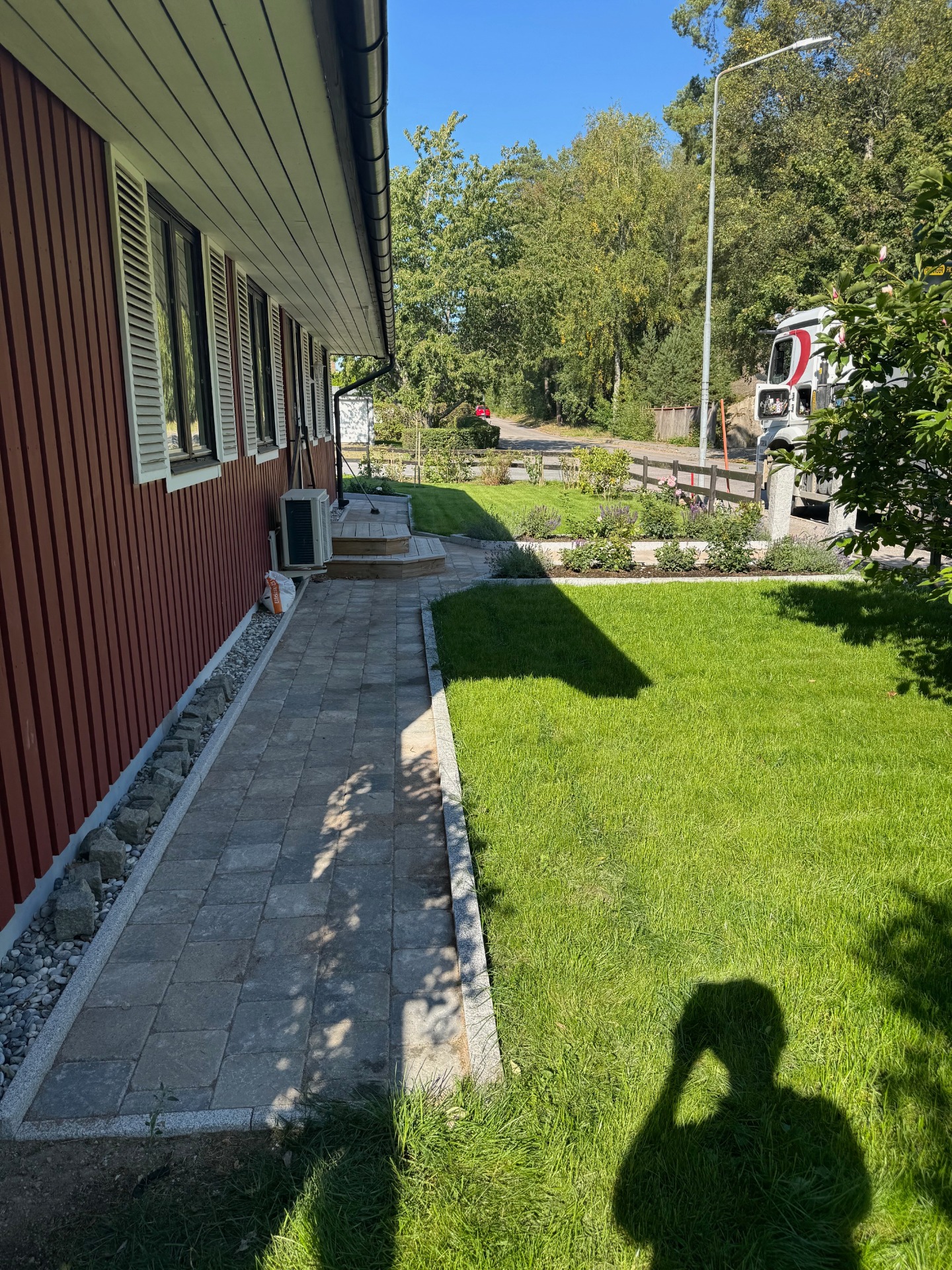 Hel utemiljö skapad åt en kund i Täby efter att vi dränerat om runt grunden och tilläggsisolerat samt värmt upp och fuktat av torpargrunden. Vi har satt kantsten, lagt plattor, byggt trappa och provisorisk trappa, monterat brunnsbetäckningar, asfalterat satt tunga stenstolpar med kran etc hela markytan utsidan förutom staketet.